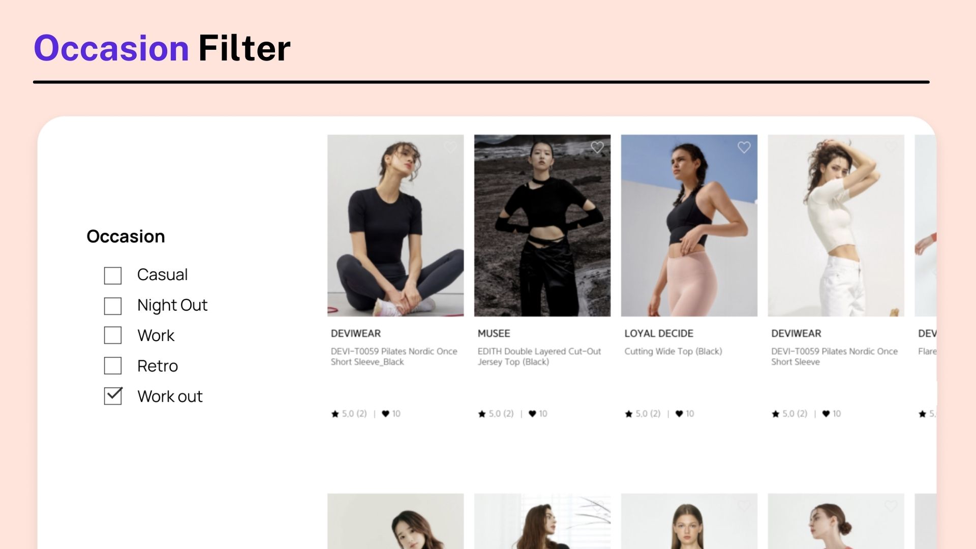 Occasion (or thematic) filters offer a way for shoppers to search by their favorite occasion or vibe, from wedding-guest to a night-out. While thematic filtering has proven to be challenging for retailers, YesPlz makes it seamless by using AI-powered tagging to accurately label products for occasions. Then, using the tags, we create smart product filters. The end result? Shoppers can easily filter by their favorite occasion, retailers don't need to build technology in-house, and product filtering becomes more enjoyable.