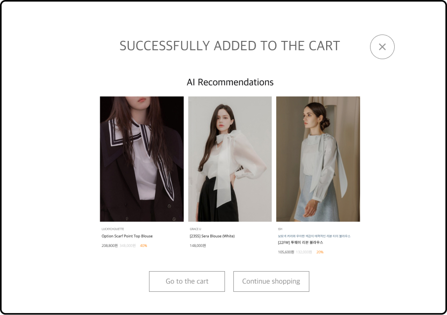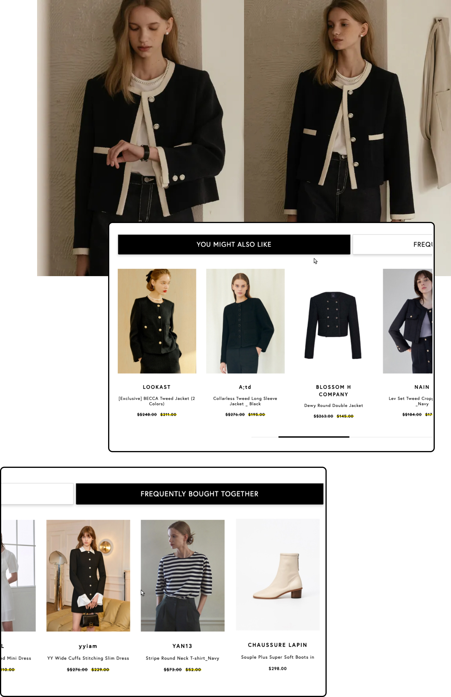 YesPlz fashion recommendations showed off W Concept's large catalog with both collaborative and similar recommendations. For similar recommendations, AI matches the key design attributes to products, then matches the recommendation against vibe/occasion, creating the perfect recommendation. Collaborative filtering builds off similar recommendations, solving any cold start problems.