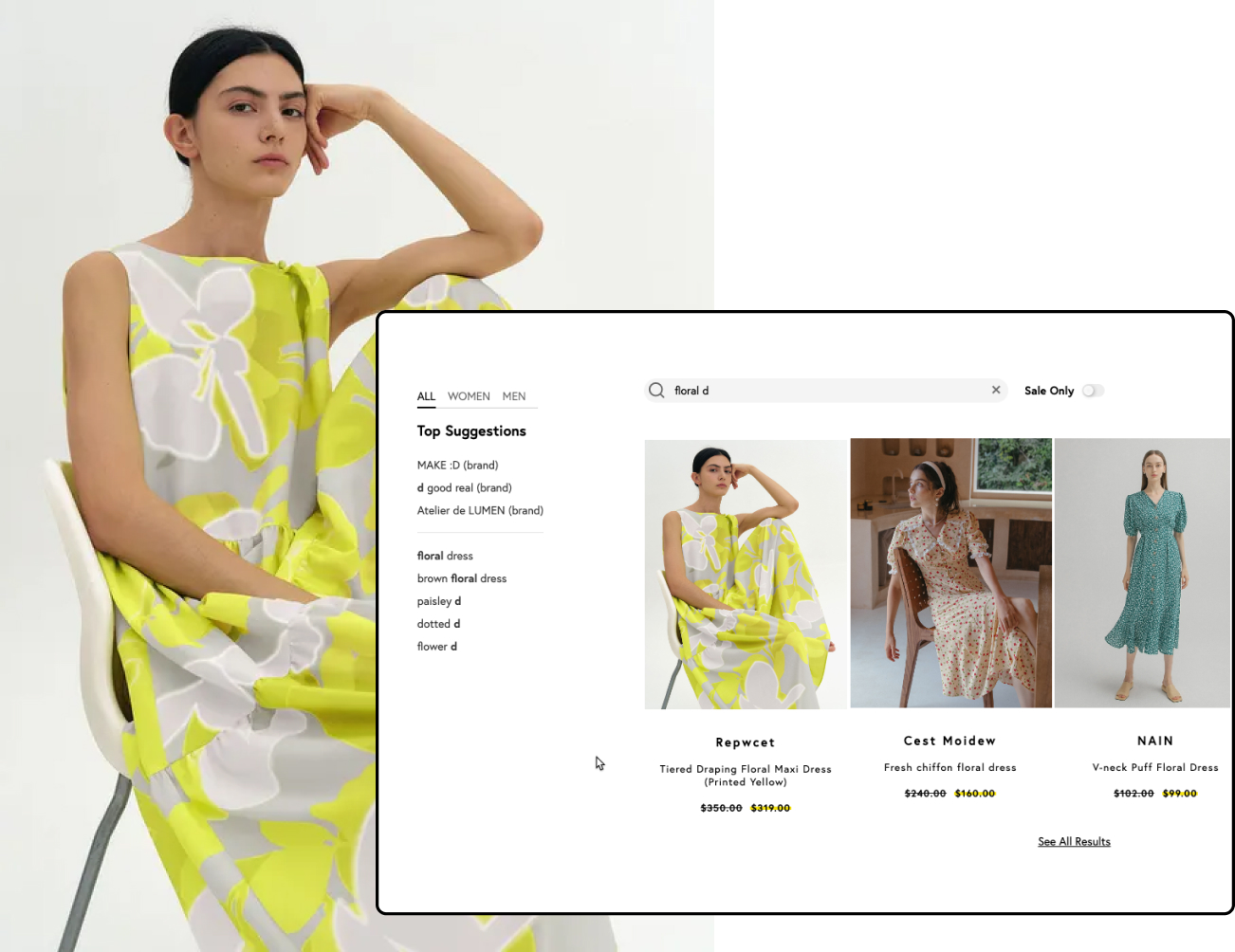 W Concept shoppers don't need to know the exact keywords that match a product description. By using fashion AI to tag W Concept's product catalog, which are then automatically added to search results, shoppers see more search results that match their search intent. Automated popular keywords, integrated product previews, and a mini-filter help guide W Concept shoppers along the discovery journey.