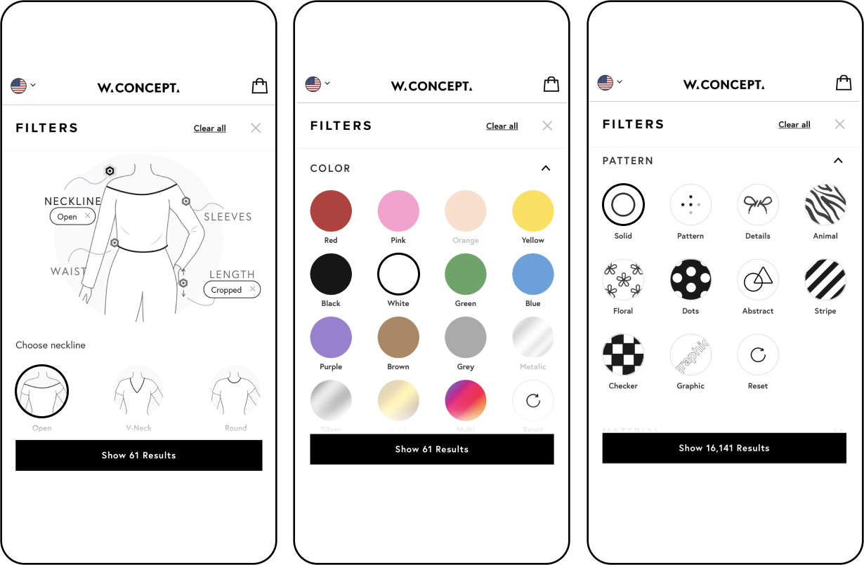 The Virtual Mannequin Filter uses a mix of visual search and fashion AI, so W Concept shoppers receive accurate, instant search results. The design is UX-friendly, visually-focused, and easy to navigate.