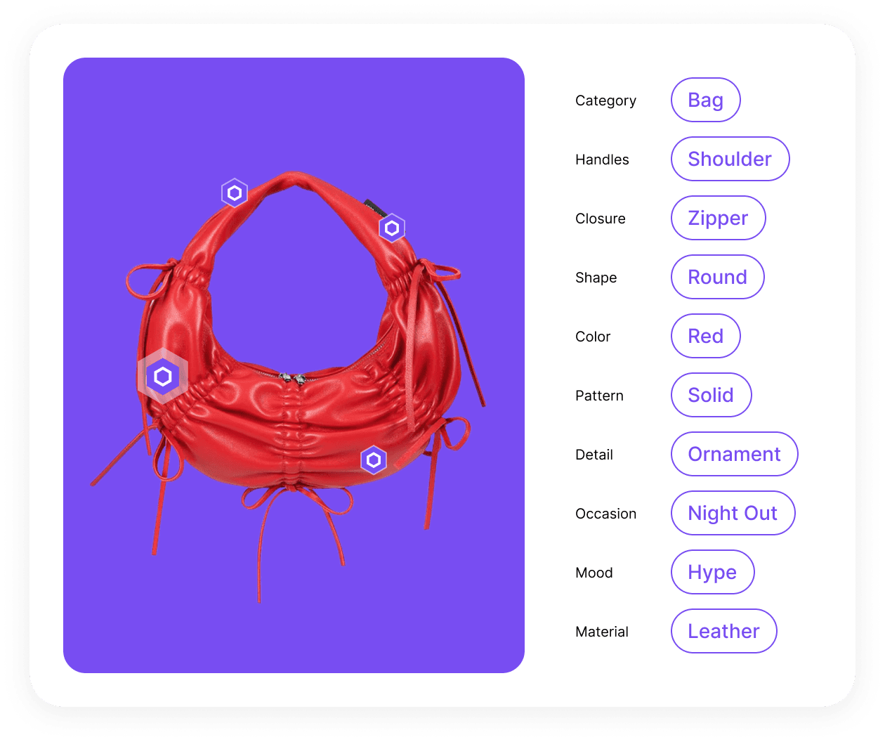 We’ve got the key attributes matter the most to shoppers: silhouette, color, pattern, details, and even mood. Automate the tagging process and get richer product information for your catalog. Make the shopping experience delightful!