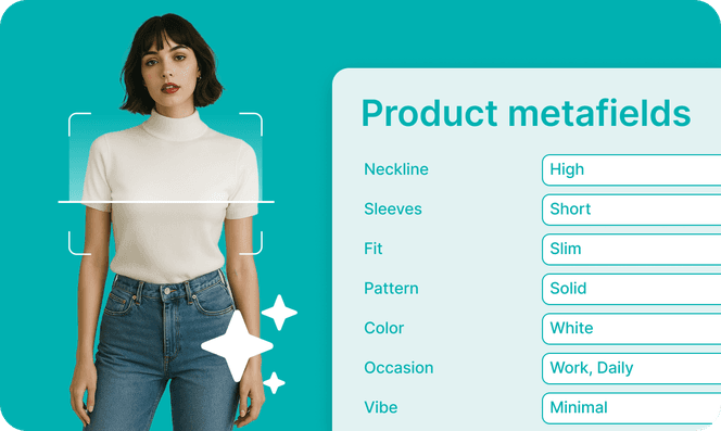 Our AI will tag product details from your product images and automatically update them in your Shopify metafields. Richer data fully ready to power search, filtering, and automated collections.
