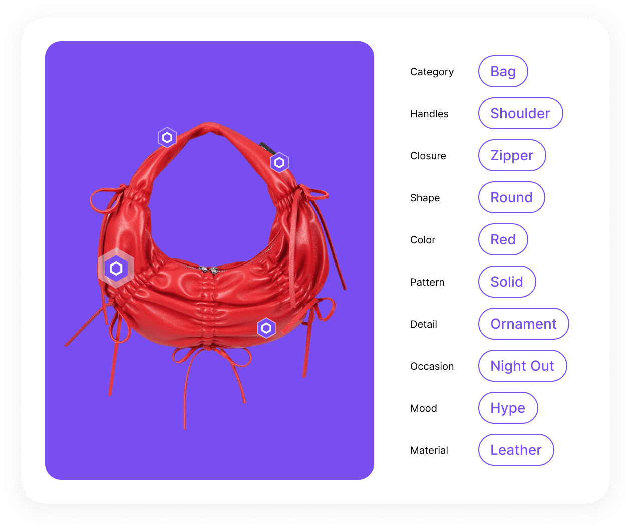 We studied the key product attributes that matter most to shoppers: silhouette, color, pattern, details - and even mood. With an automated product tagging process, you'll receive richer product information for your catalog.