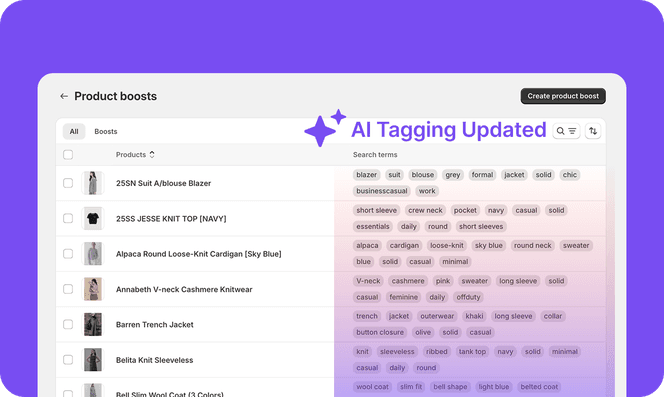 AI Tagging automatically categorizes your products by occasion and vibe - whether it's romantic, chic, or off-duty. We've identified key fashion lifestyle categories so shoppers can discover pieces that match their mood and personal style effortlessly.