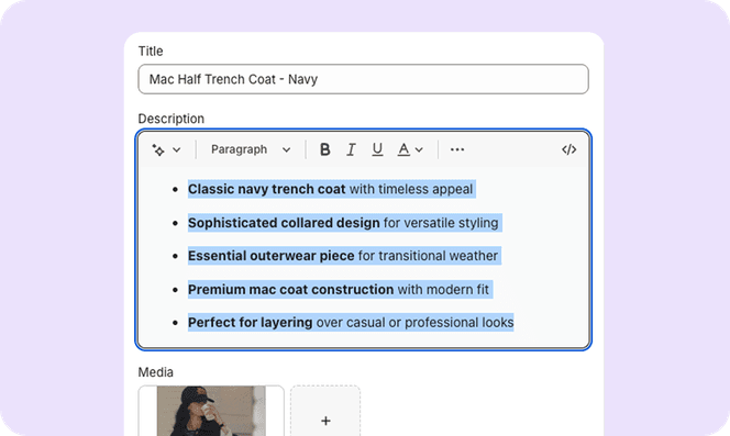 AI tagging automatically generates rich, keyword-optimized product descriptions and metadata that search engines love. Boost your organic rankings and product visibility with comprehensive tags that include style attributes, materials, occasions, and trending fashion keywords - all without manual SEO work.