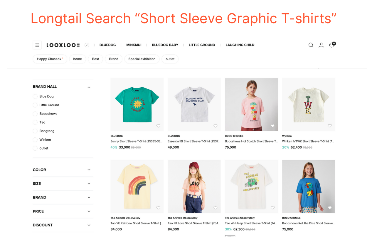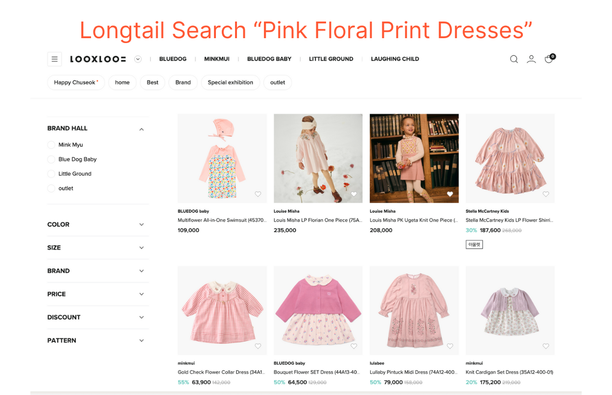 Longtail queries, for instance, "pink floral print dresses" or "short sleeve graphic t-shirts," reflect how parents actually shop. These searches combine multiple, specific attributes within a single phrase.