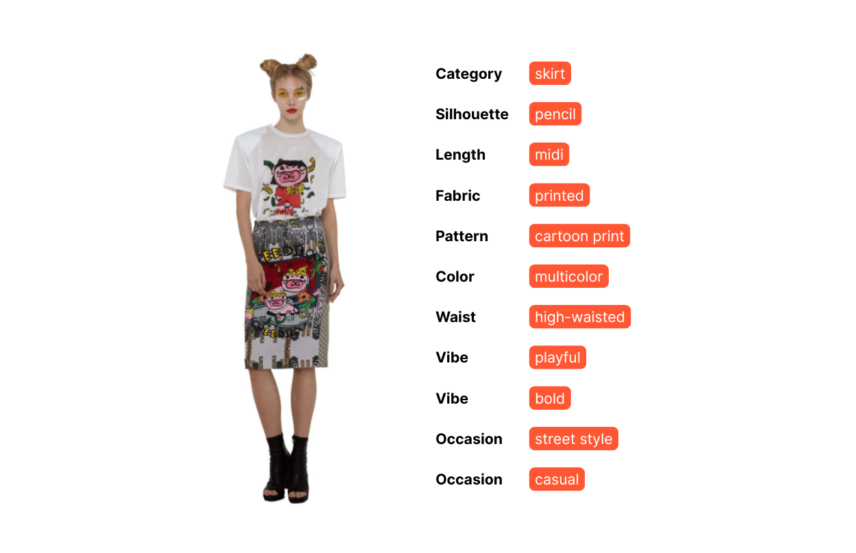 Manual tagging can take hours to complete and is prone to error. For example, one human tagger might label the red skirt as ‘mid-length skirt.’ Yet, another might consider it to be a ‘midi-skirt.’ Human subjectivity often leads to inaccurate product data.