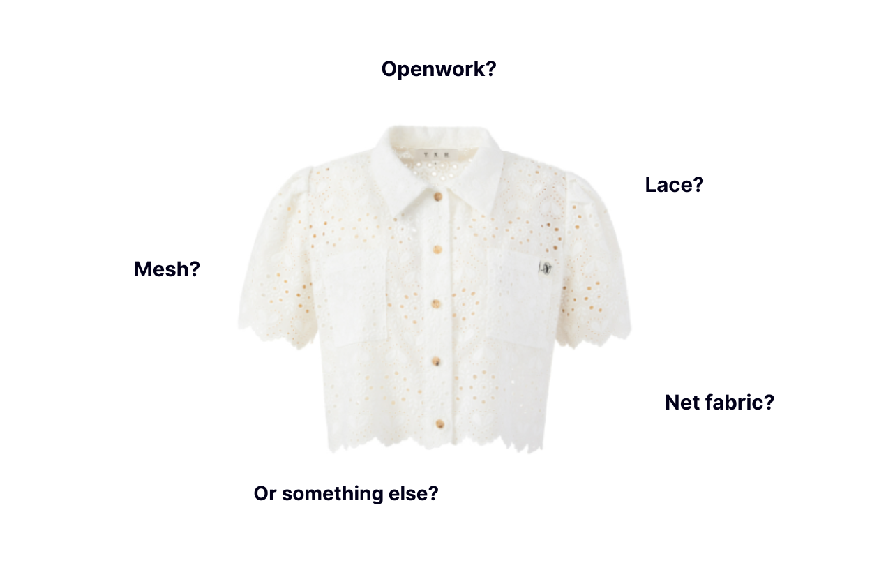 Information that comes from third parties, however, may be inconsistent. For instance, how do you call the shirt fabric in the image below? Lace? Net fabric? Mesh? Openwork? Or something else? Each vendor may use a different word to describe it.
