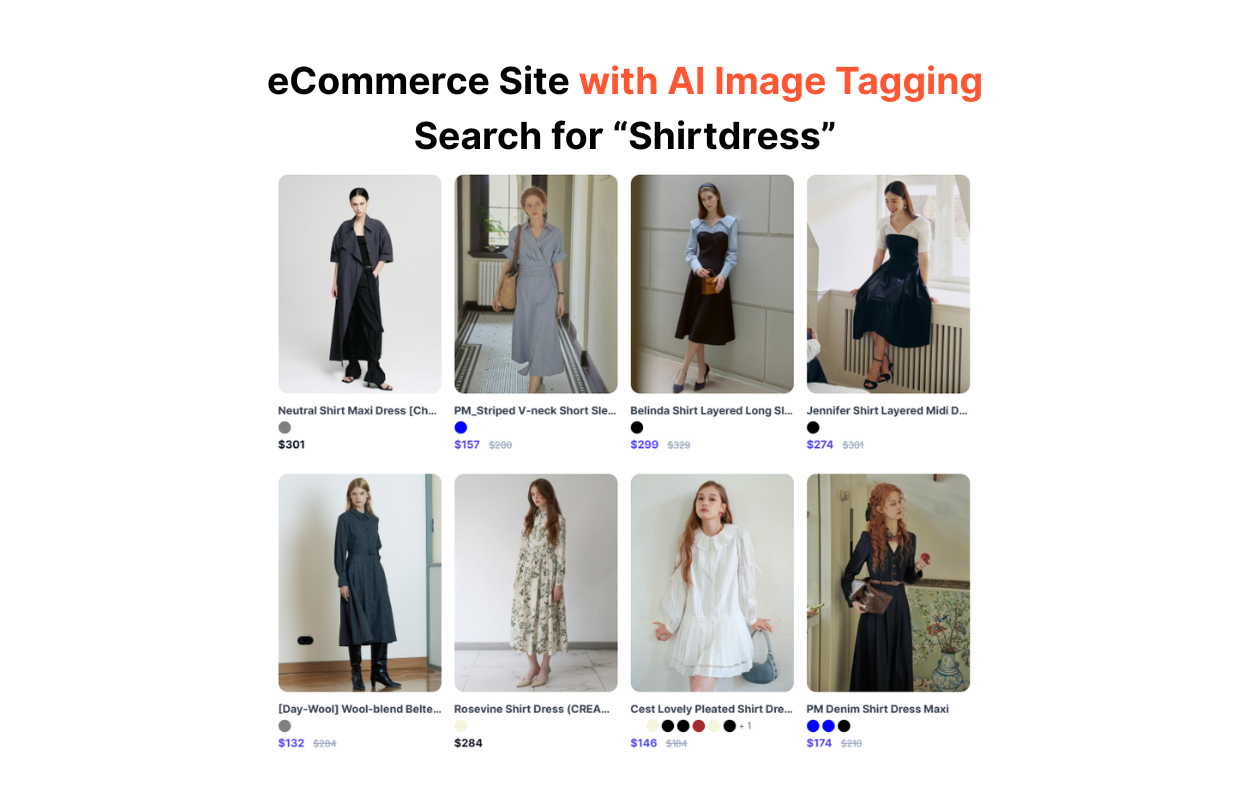 A shopper is looking for a shirtdress, defined as a dress with a collar and buttons. Let’s compare what she sees on two different fashion eCommerce sites with and without AI image tagging.