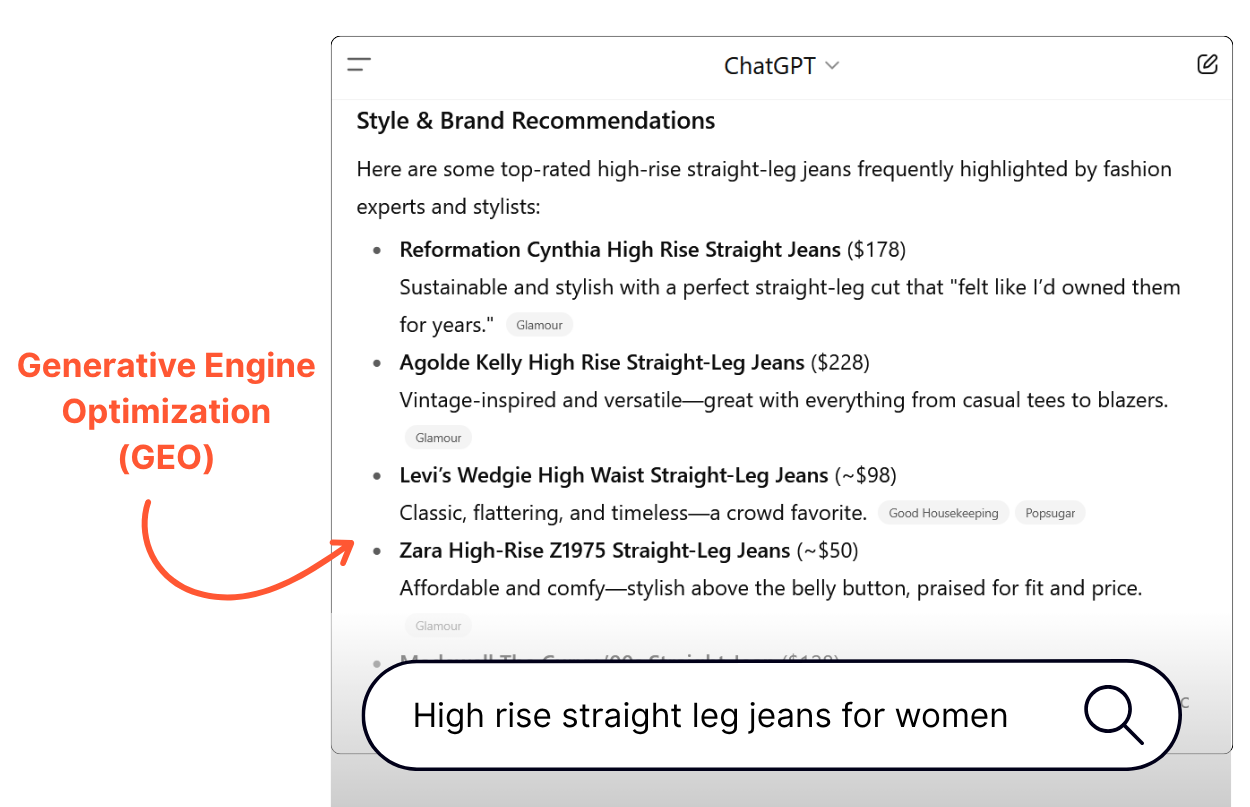 GEO (Generative Engine Optimization) ensures your product pages are referenced and cited in AI-generated responses.