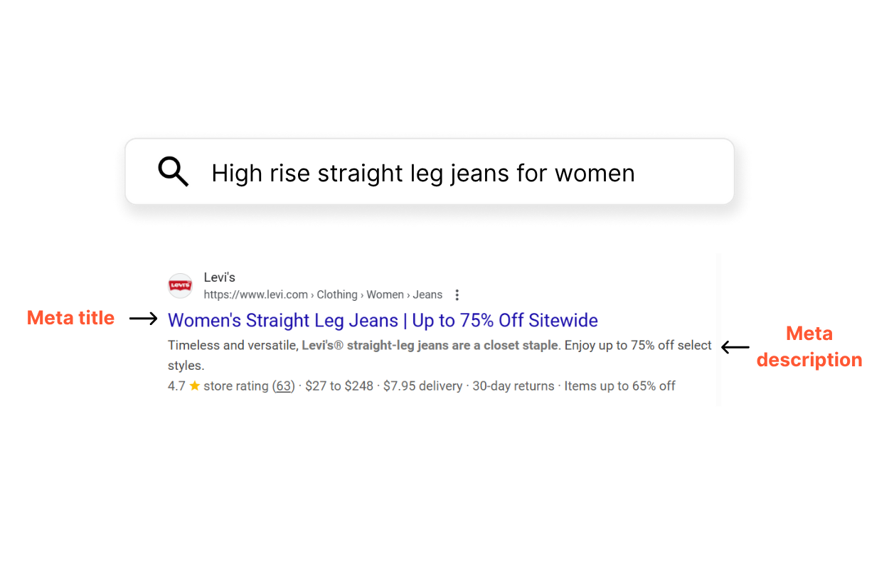 A meta title is a blue, clickable headline that appears in search results. It tells both shoppers and search engines what your product page is about. A meta description is under the blue headline. It is a short gray text that provides a quick summary of a page. By reading it, shoppers can decide whether or not to click.