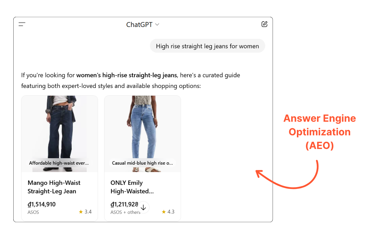 AEO, or Answer Engine Optimization, enables AI chatbots to discover and recommend your product pages as one of the options.