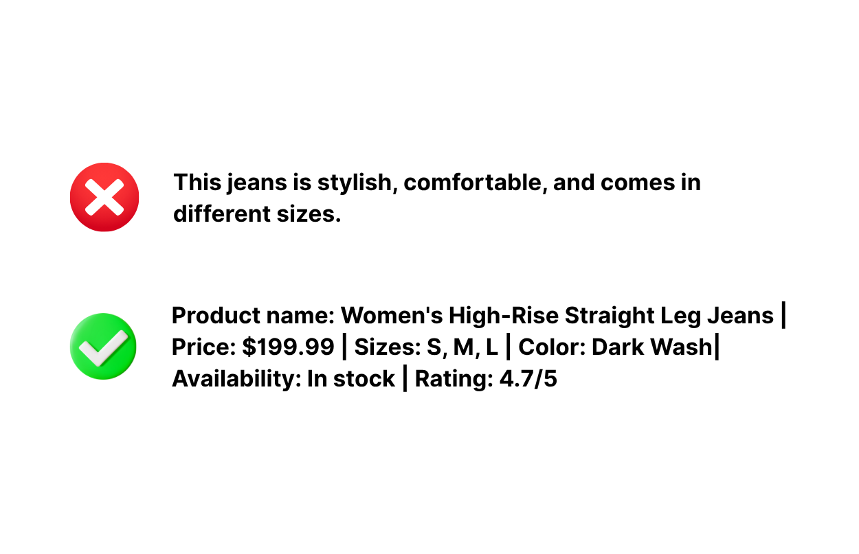 Search engines reward structured, consistent, keyword-rich data with higher rankings. Answer engines prefer content that directly addresses user needs in a clear, human-friendly way. Generative AI systems rely on well-structured sources to generate accurate responses, meaning your product pages are more likely to be cited.