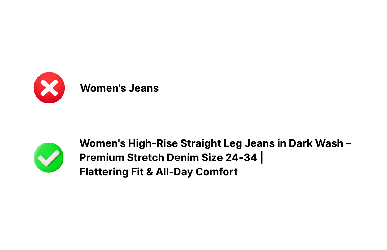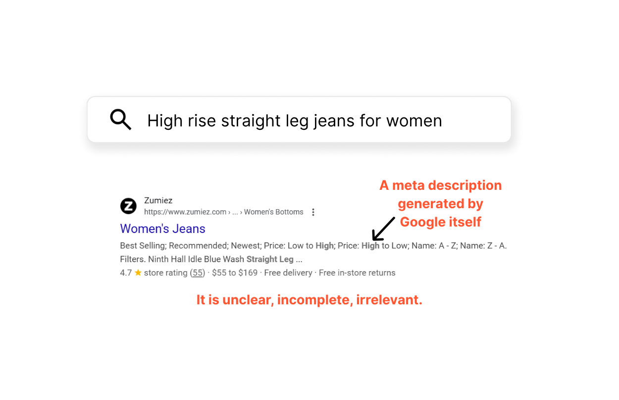 Before optimization, many fashion retailers unknowingly leave money on the table. They don’t have time working on meta titles, meta descriptions, and product descriptions. These core elements are often outdated, duplicated, or left blank. Search engines automatically generate unclear, irrelevant, and inconsistent ones. Shoppers don’t feel interested when they see them. As a result, they skip your product pages, and your CTRs stay low.