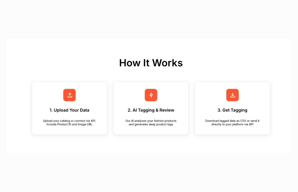 If you are a fashion retailer, you can simply provide a product image URL and a unique ID to our Fashion Tagger. You’ll get 10-15 key tagging results, which have been trained on over a million fashion data points, and finally pay for what you tag.