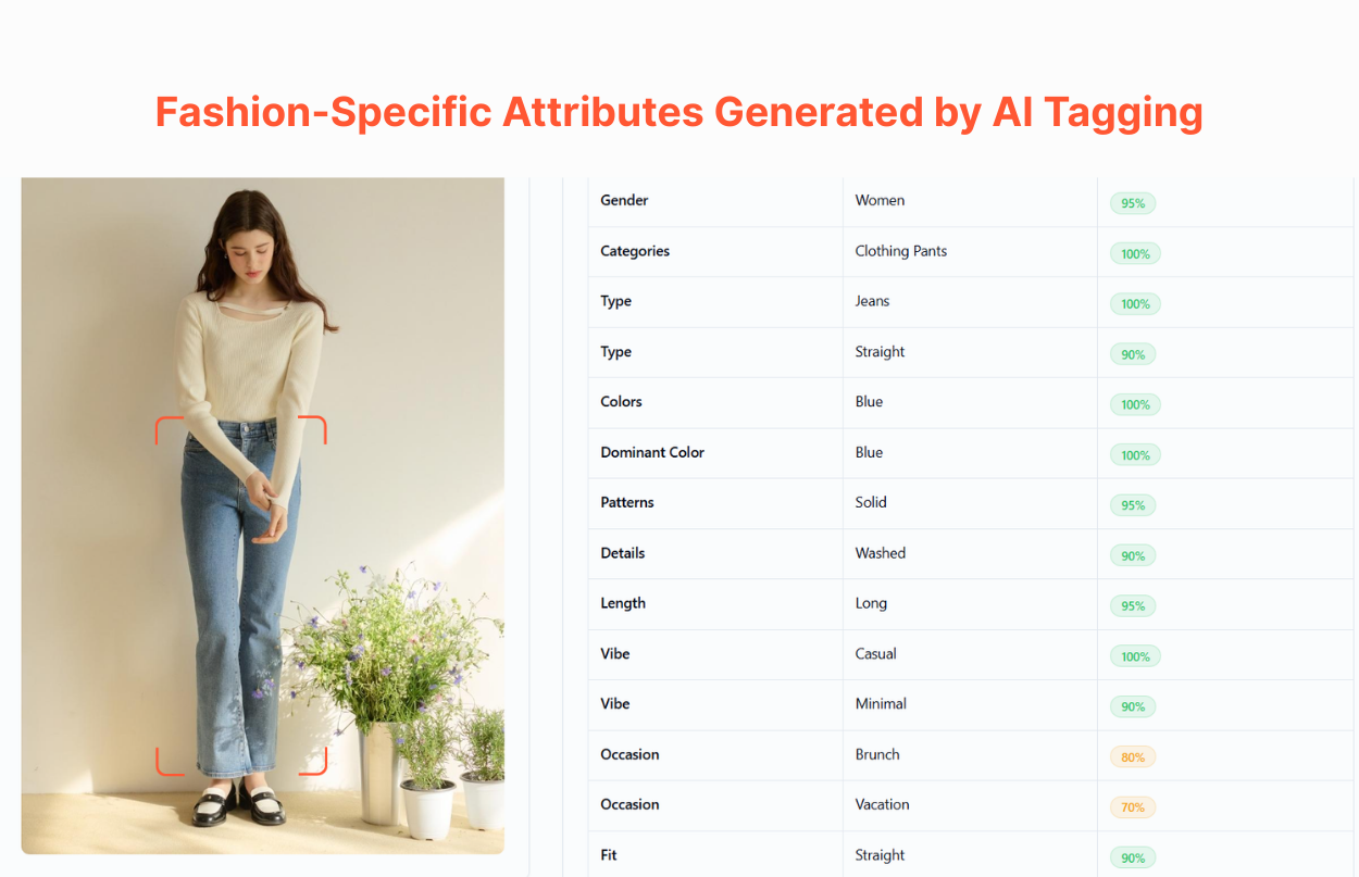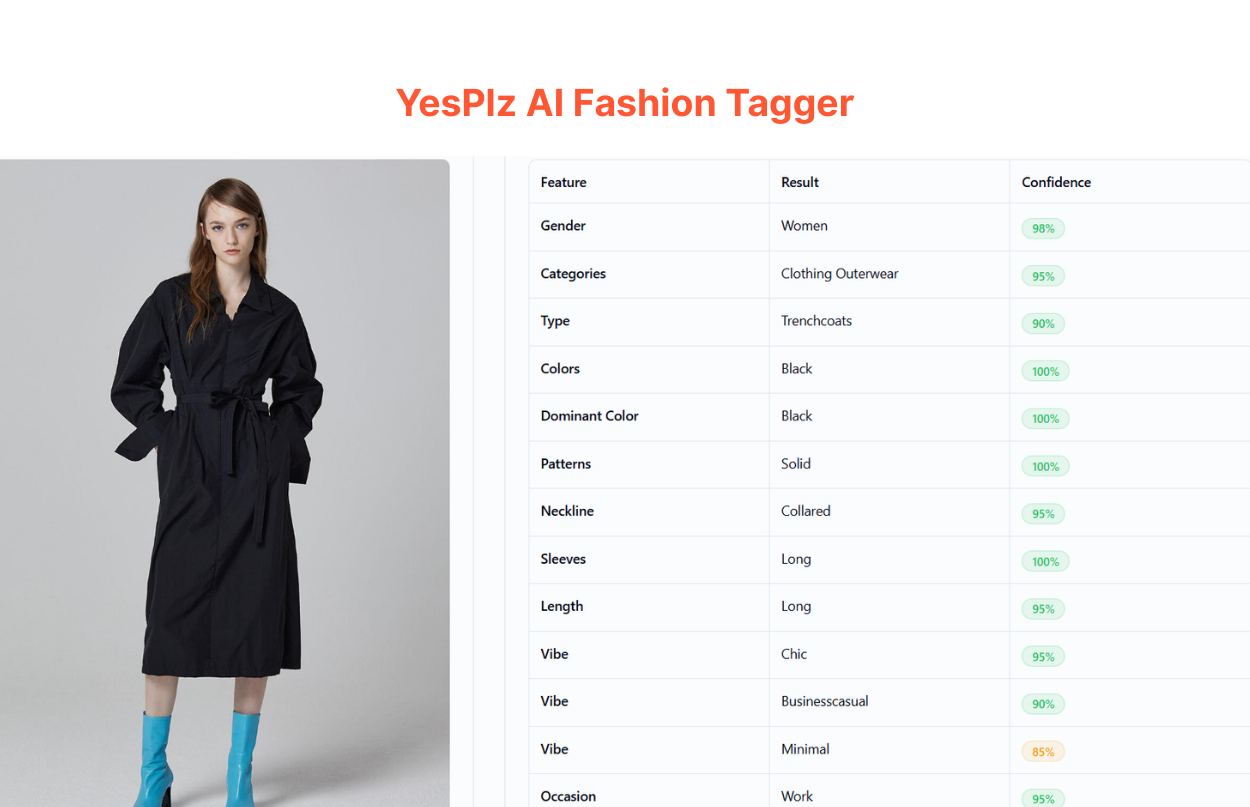 The AI extracts detailed, accurate tags based on its analysis. For example, YesPlz AI fashion tagging is built on millions of fashion data points. The system can generate 20-60 attributes for a single product, from silhouettes and styles to materials and aesthetics.