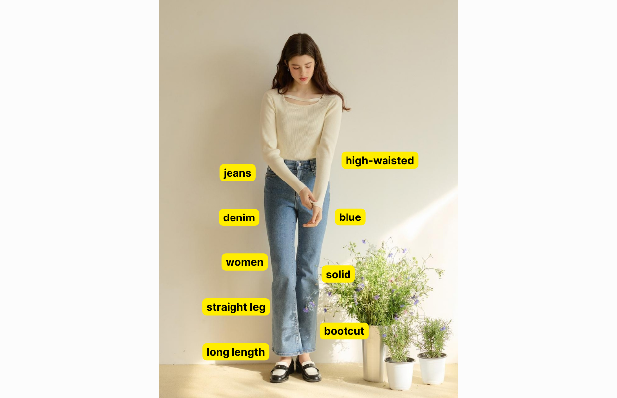 As you can see, the system identified and extracted multiple fashion tags, including gender, category, color, pattern, details, vibe, and occasion. With this rich product data, whether shoppers type ‘women’s slim, long, bootcut, high-waisted denim pants,’ ‘high-waisted blue jeans,’ or any combination of these words, this product always shows up in their search results.