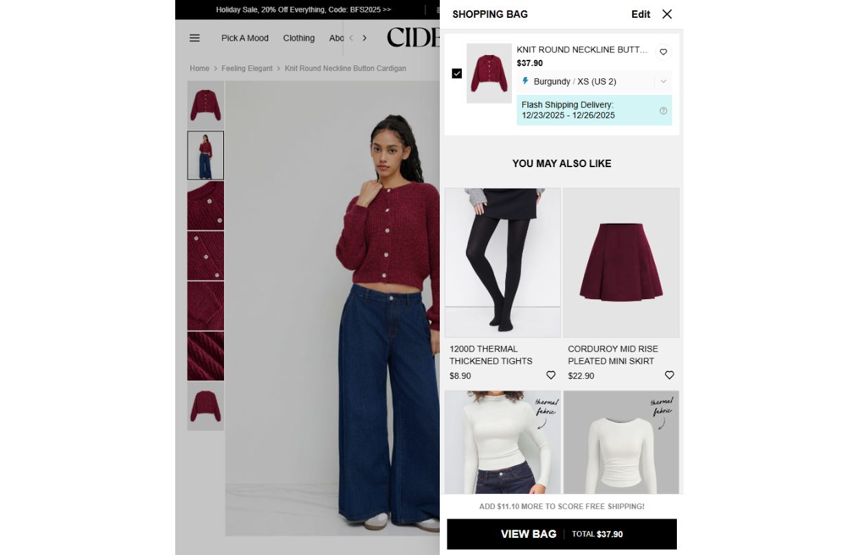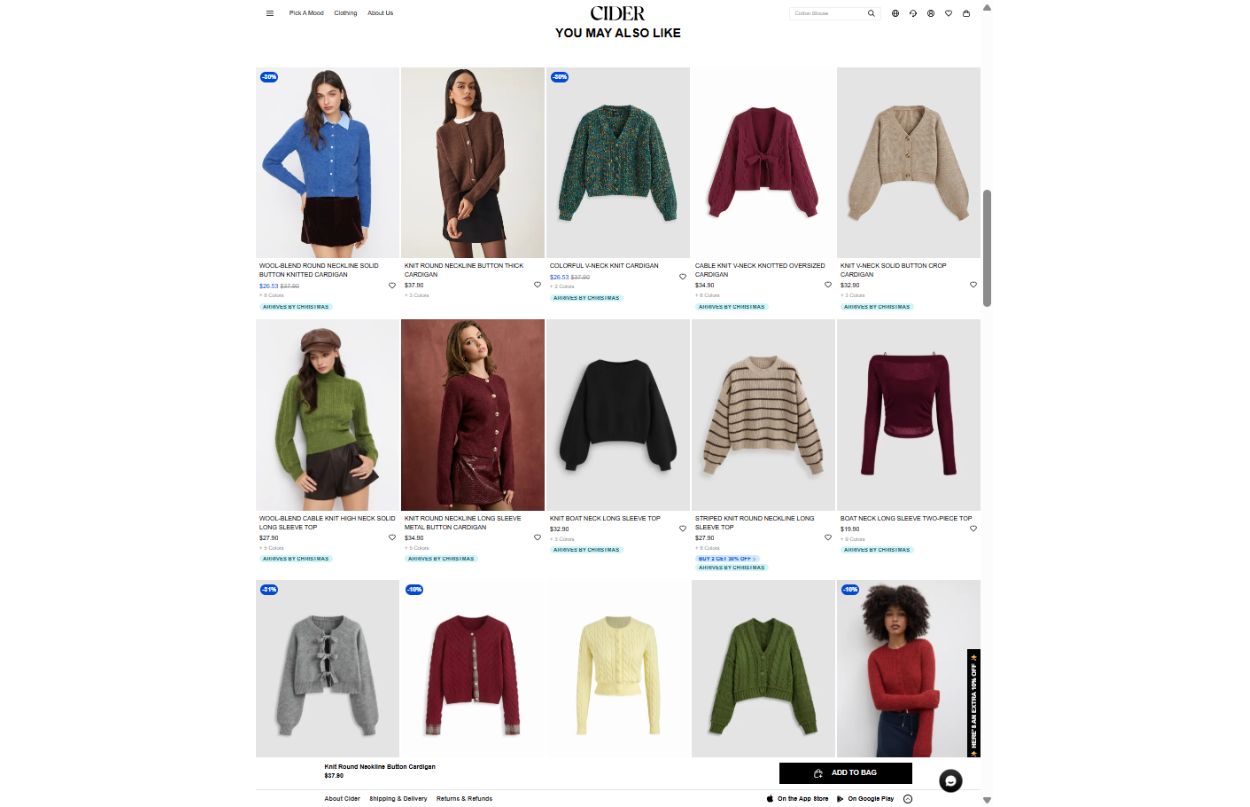 Visit Cider’s website, and you’ll notice something immediately: Their recommendations never stop. Scroll through their PDPs, and you’re met with a continuously flowing stream of “You May Also Like” suggestions that feel handpicked for your taste.